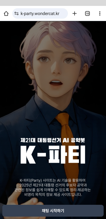 K-파티 는 2025년 대선을 앞두고 각 후보자의 주요 정책 공약을 AI 챗봇 형태로 제공합니다. 복잡하고 방대한 대선 공약 정보를 쉽게 확인하고 비교할 수 있는 AI 기반 플랫폼, K-파티(Party) 사이트입니다. 캐릭터와의 자연스러운 채팅 인터페이스를 통해 복잡한 내용을 쉽게 이해하고, 주요 후보들의 공약을 주제별로 비교할 수 있는 정보 사이트입니다.